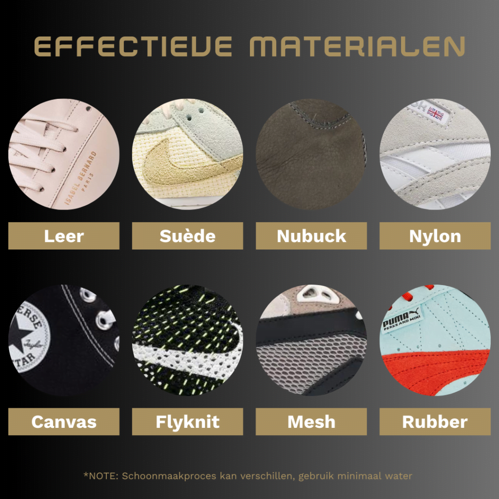 Onze speciaal ontwikkelde oplossing is ontworpen om je sneakers te reinigen en de oorspronkelijke uitstraling te herstellen zonder de materialen te beschadigen. De krachtige reinigingsmiddelen verwijderen efficiënt vuil en vlekken, waardoor je schoenen er weer als nieuw uitzien. Geschikt voor onder andere leer, suède en canvas.